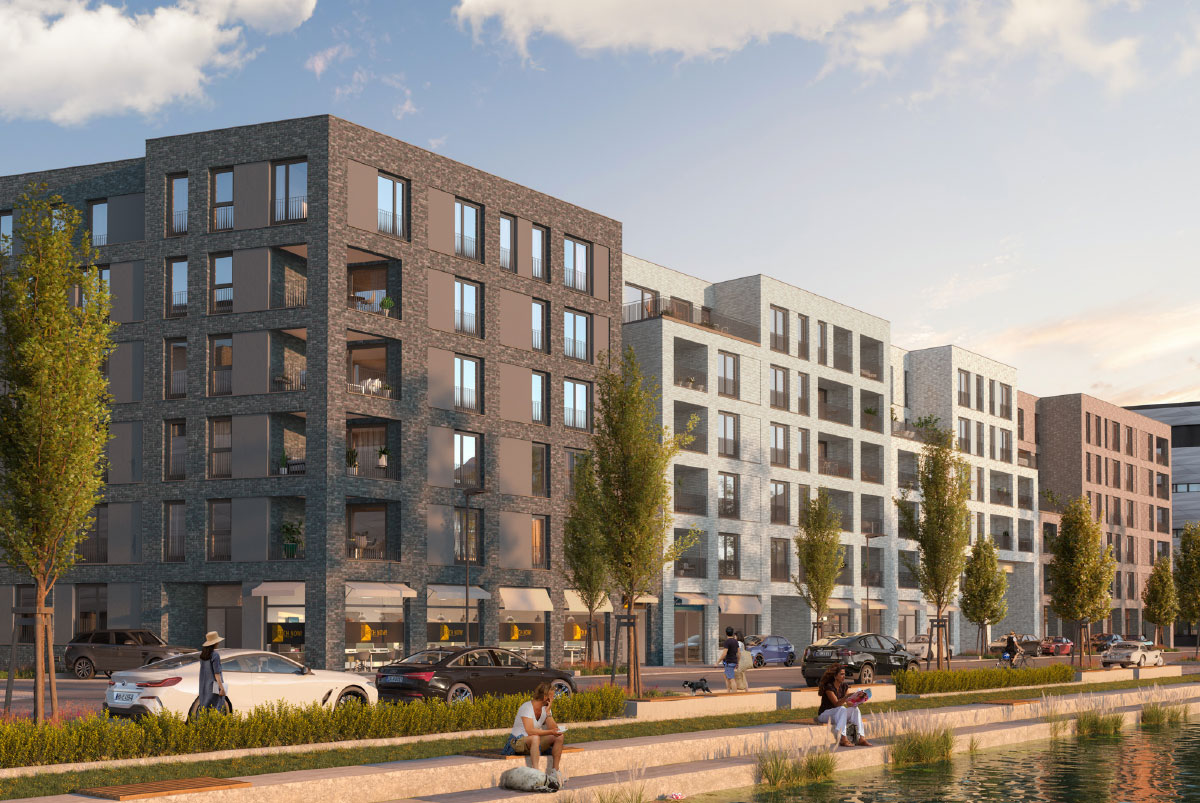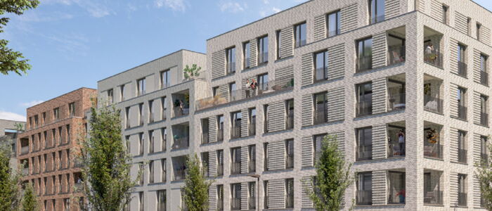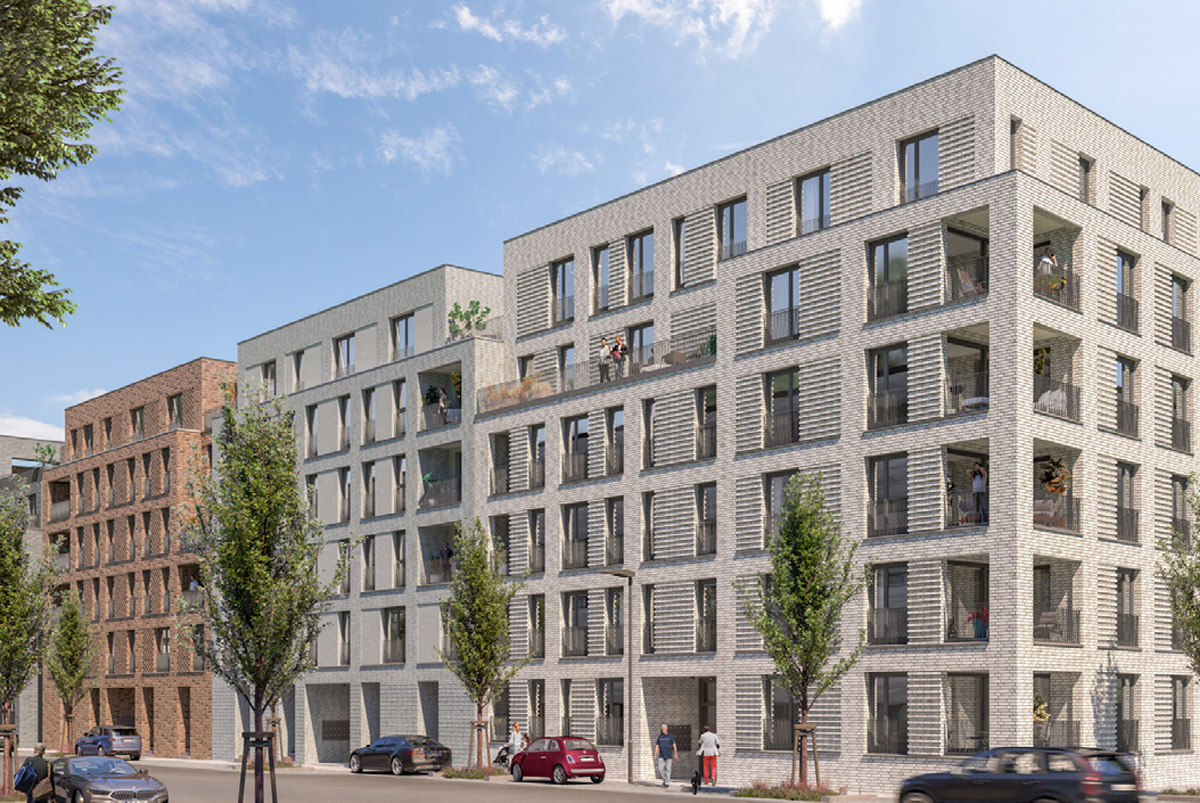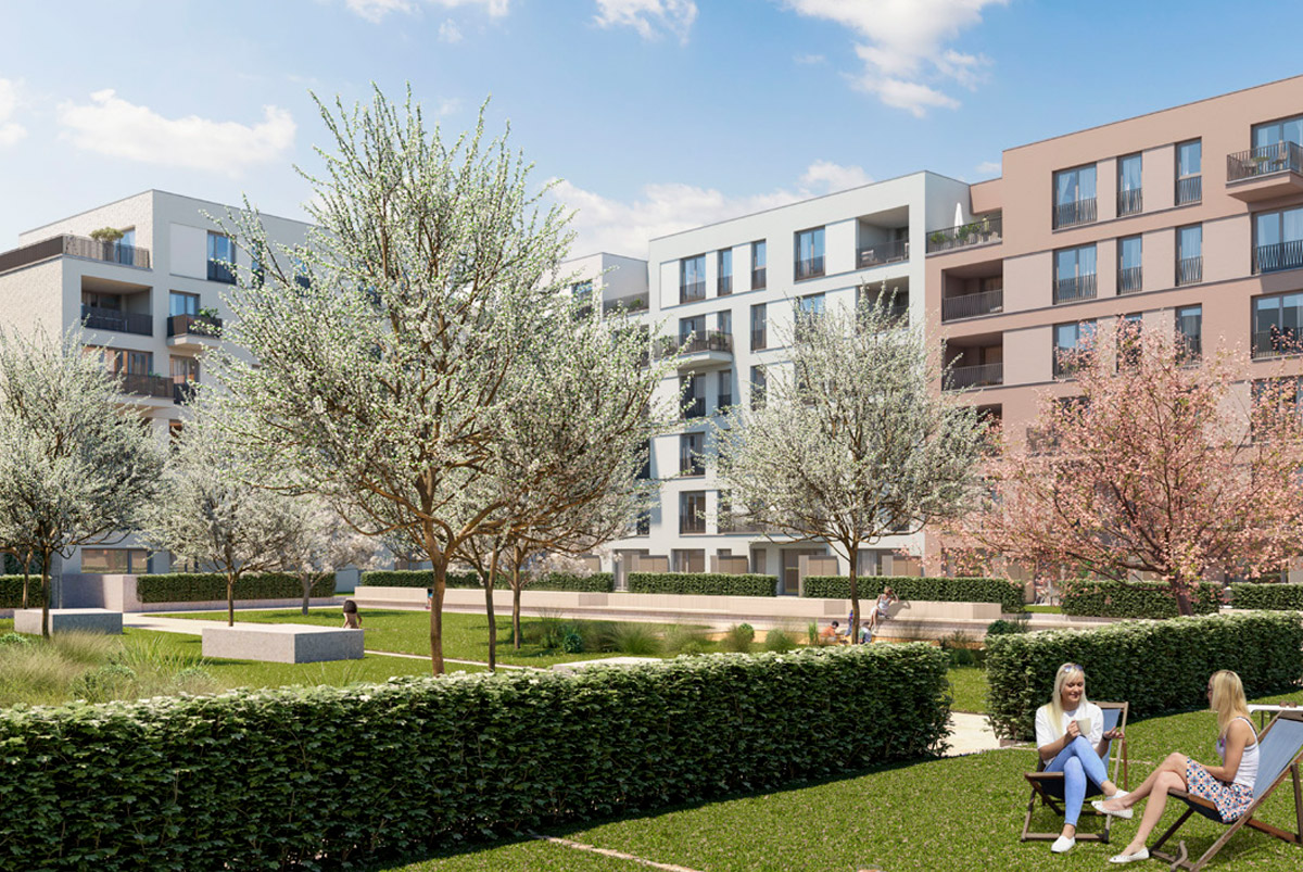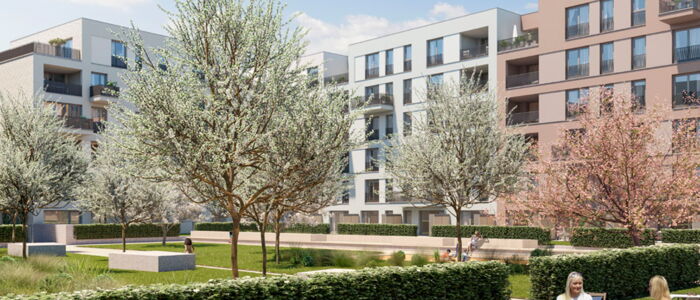 Die Wohnungen verteilen sich auf bis zu sechs Vollgeschosse. Die Wohnformen reichen von klassischen 2- bis 4-Zimmer-Etagenwohnungen über großzügige Penthouse-Wohnungen mit Dachterrassen oder Townhouse-Wohnungen als Haus-in-Haus-Konzept bis hin zu Atelierwohnungen, die Wohnen und Arbeiten miteinander verbinden. Die Wohneinheiten des Gartengeschosses selbst liegen Hochparterre und binden in der Regel direkt an den begrünten Innenhof an, der mit privat und gemeinschaftlich genutzten begrünten Freiräumen oberhalb der Tiefgarage liegt. Die gemeinschaftlich genutzten Freiräume werden auto- und stufenfrei mit Spiel- und Erholungsflächen sowie heimischem Grün und schattenspendenden Bäumen ausgebildet.